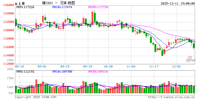 ccmn沪镍走势:今日午盘后沪期镍下跌,沪期镍主力月2601合约开盘报116970元/吨,盘中最高报116970元/吨,最低价报115520元/吨,收盘报115870元/吨,下跌1070元/吨,跌幅为0.91%,沪镍主力月2601主力合约成交量106815手。