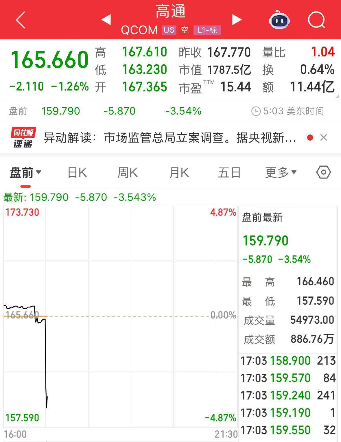 正文 涉嫌违反反垄断法,高通公司被市场监管总局立案调查!公司股价盘前直线下跌 泰和科技 V管理员 /10-10/12阅读/0评论 1010 文章最后更新时间2025年10月10日,若文章内容或图片失效,请留言反馈! 据央视新闻10月10日消息,因高通公司收购Autotalks公司未依法申报经营者集中,涉嫌违反《中华人民共和国反垄断法》,市场监管总局依法对高通公司开展立案调查。市场方面,高通美股盘前股价直线下跌,截至发稿前跌幅为3.54%。每日经济新闻综合央视新闻、公开信息免责声明:本文内容与数据仅供参考,不构成投资建议,使用前请核实。据此操作,风险自担。
